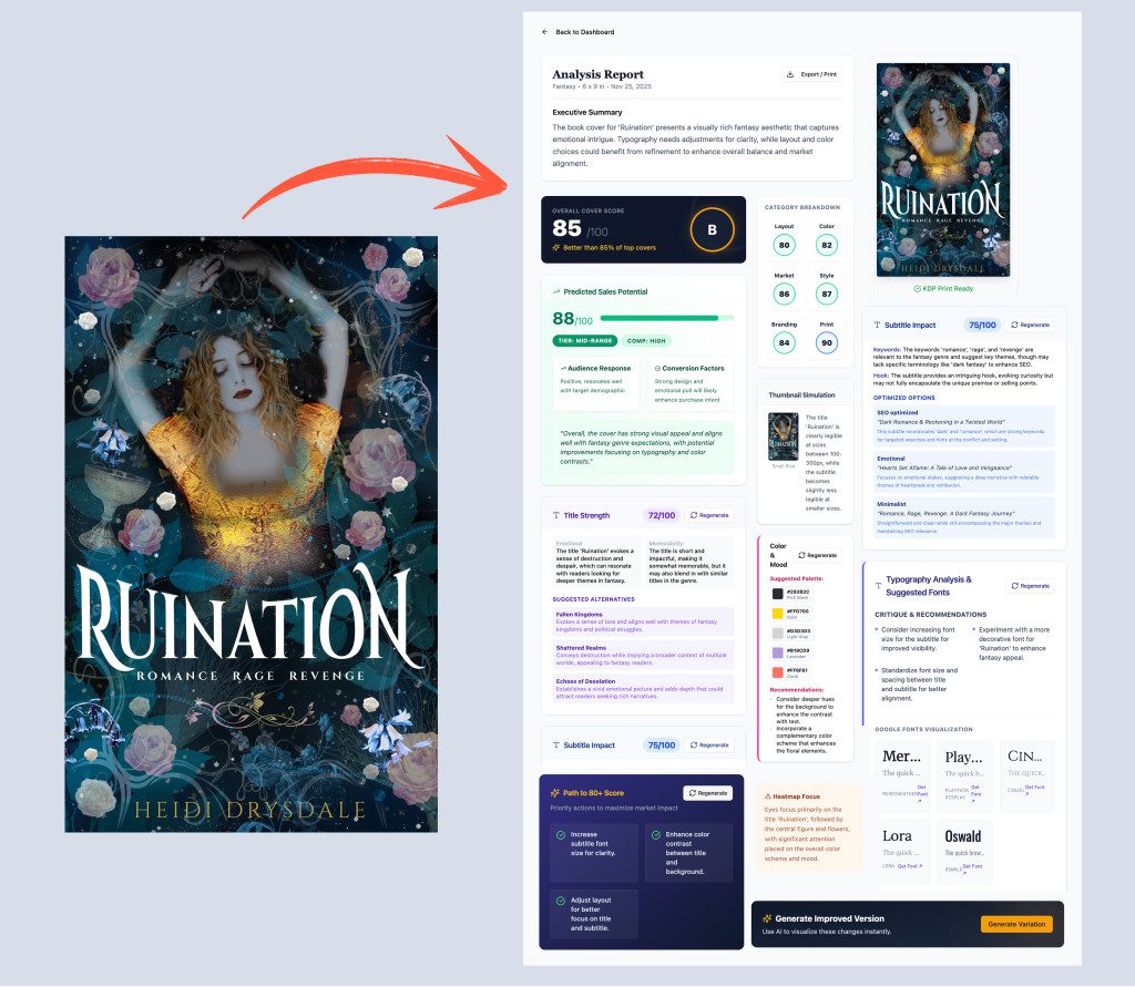 We’ve partnered with CovrCraft, an AI-powered book cover analysis tool that evaluates your cover design for marketability, genre fit, readability, and competitive strength—instantly. Get data-backed insights that help your cover stand out and sell.