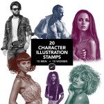 Bring your character illustrations to life instantly with this 20-piece Procreate Character Stamp Brush Set — featuring 10 men and 10 women, each with unique illustrated poses and styles.